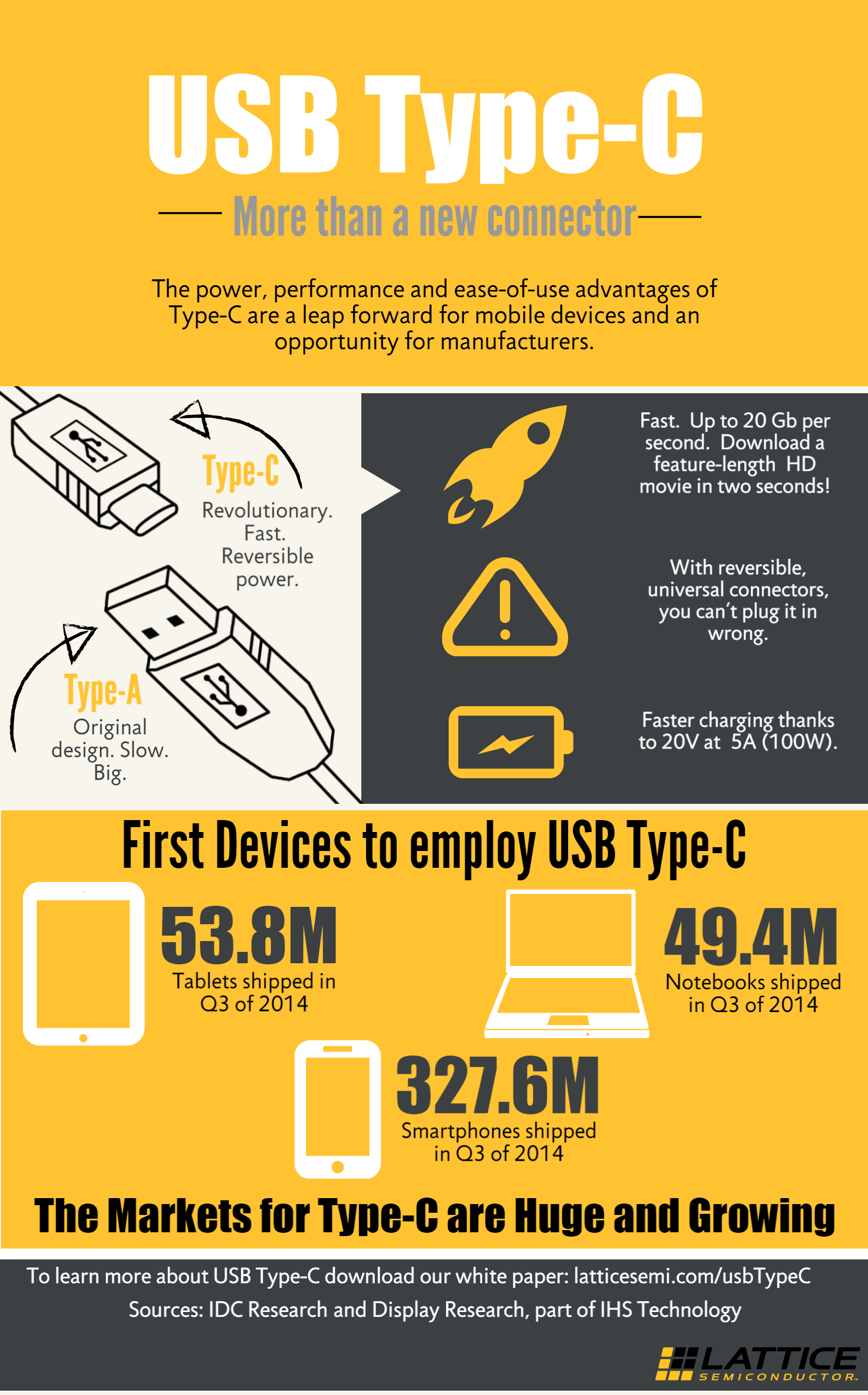 USB Type-C enables products to provide faster charging, faster downloads and support other standards such as DisplayPort and MHL over Type-C. Lattice Type-C solutions provide Cable Configuration (CC), Power Delivery (PD) communication required to unlock these benefits. Some parts include integrated switches to simplify the implementation of video output.