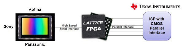 几款TI摄像机设计采用了莱迪思FPGA,用于实现图像传感器的桥接,如下图所示。