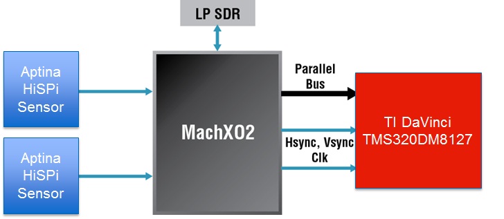 ラティスMachXO2のデュアルセンサインタフェースボード(DSIB)はTI DaVinciのTMS320DM8127に接続することができます。